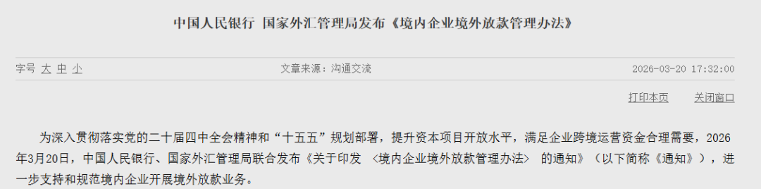 中国东说念主民银行讯息,3月20日,中国东说念主民银行、国度外汇处理局聚合发布《对于印发〈境内企业境外放款处理主张〉的见知》,进一步撑抓和法子境内企业开展境外放款业务。其中,将宏不雅审慎养息所有这个词由此前的0.5上调至0.6,更好得志“走出去”企业跨境运营资金需要。